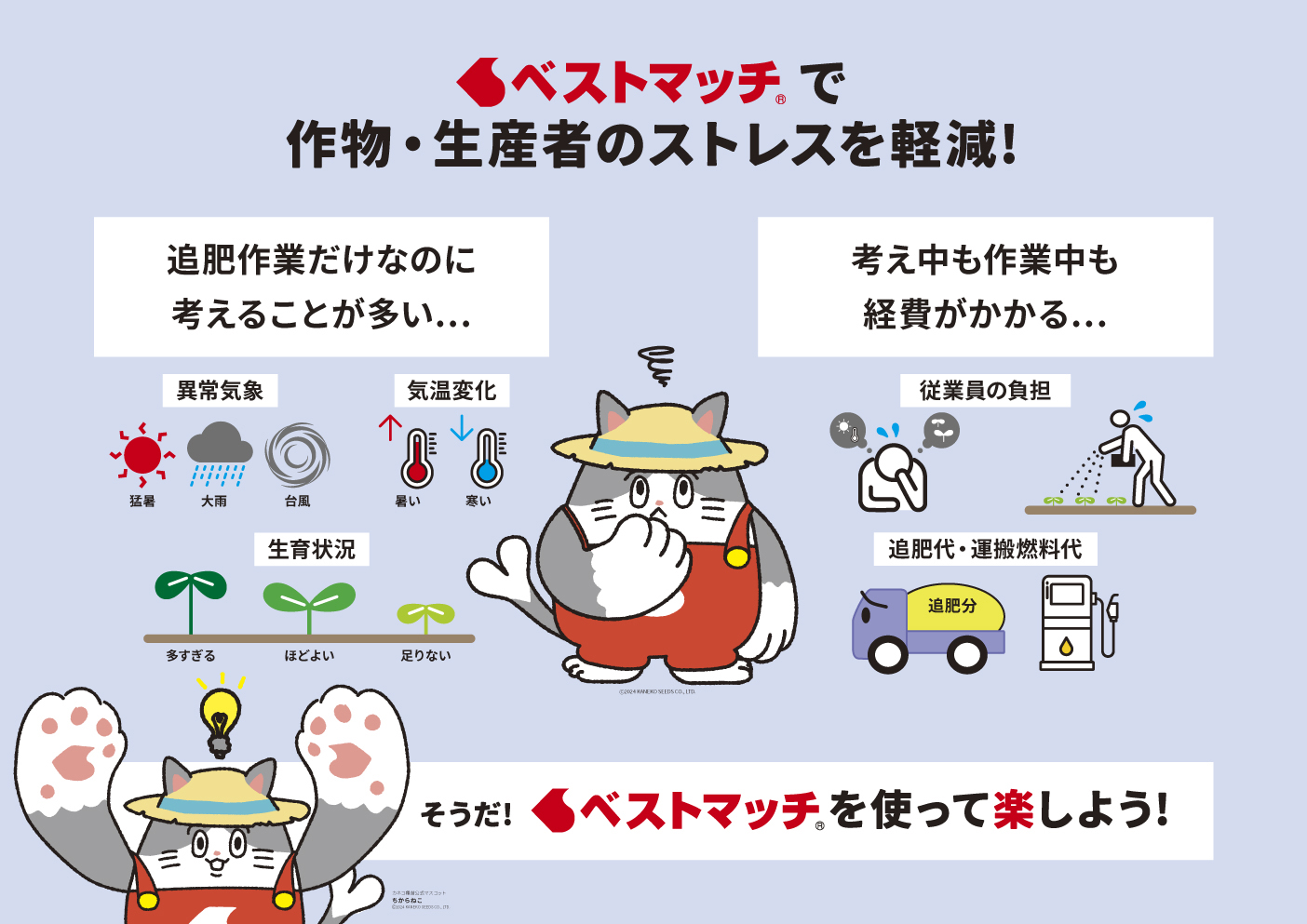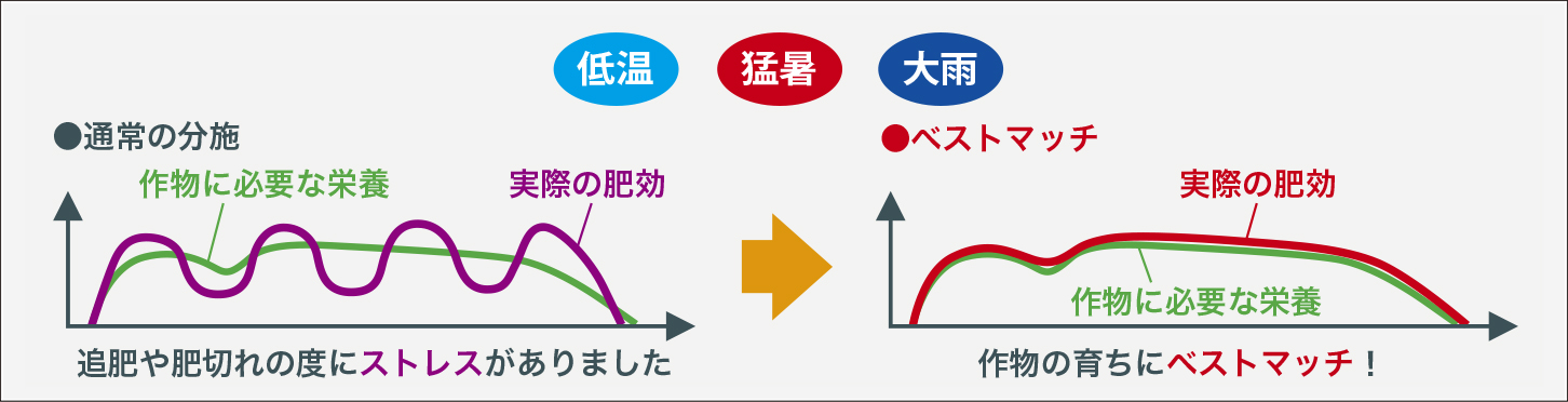 ベストマッチは、初期に必要な化成と被覆原料をいくつも組み合わせ、作型・作物毎に設計、効かせたい時期に肥料を効かせるよう、作物に好適な肥効を実現しています。作物に余計なストレスがかかりません。3.省力・低コスト